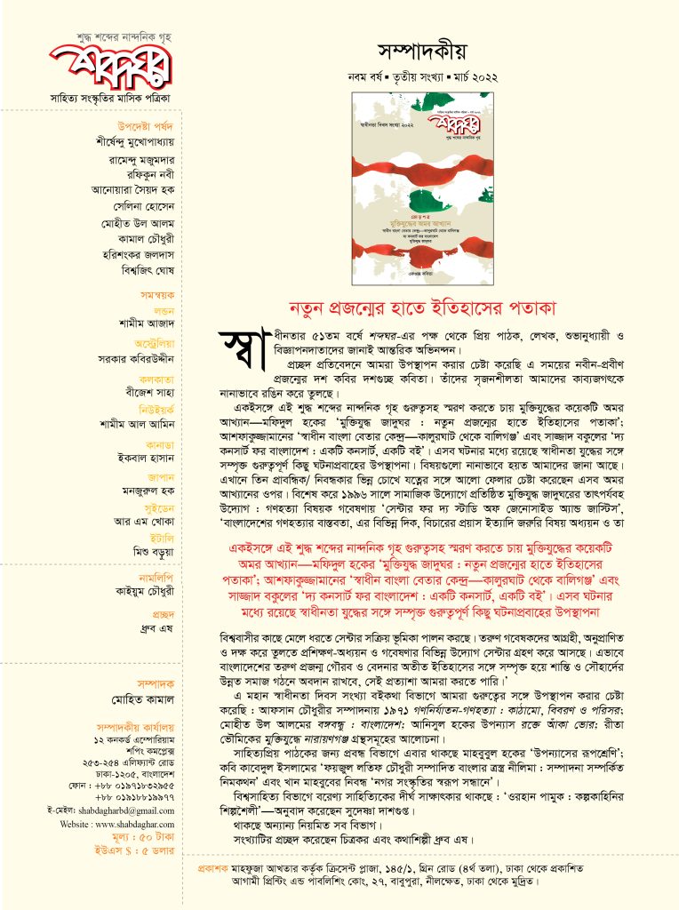 একইসঙ্গে এই শুদ্ধ শব্দের নান্দনিক গৃহ গুরুত্বসহ স্মরণ করতে চায় মুক্তিযুদ্ধের কয়েকটি অমর আখ্যান―মফিদুল হকের ‘মুক্তিযুদ্ধ জাদুঘর : নতুন প্রজন্মের হাতে ইতিহাসের পতাকা’; আশফাকুজ্জামানের ‘স্বাধীন বাংলা বেতার কেন্দ্র―কালুরঘাট থেকে বালিগঞ্জ’ এবং সাজ্জাদ বকুলের ‘দ্য কনসার্ট ফর বাংলাদেশ : একটি কনসার্ট, একটি বই’। এসব ঘটনার মধ্যে রয়েছে স্বাধীনতা যুদ্ধের সঙ্গে সম্পৃক্ত গুরুত্বপূর্ণ কিছু ঘটনাপ্রবাহের উপস্থাপনা। বিষয়গুলো নানাভাবে হয়ত আমাদের জানা আছে। এখানে তিন প্রাবন্ধিক/ নিবন্ধকার ভিন্ন চোখে যত্নের সঙ্গে আলো ফেলার চেষ্টা করেছেন এসব অমর আখ্যানের ওপর। বিশেষ করে ১৯৯৬ সালে সামাজিক উদ্যোগে প্রতিষ্ঠিত মুক্তিযুদ্ধ জাদুঘরের তাৎপর্যবহ উদ্যোগ : গণহত্যা বিষয়ক গবেষণায় ‘সেন্টার ফর দ্য স্টাডি অফ জেনোসাইড অ্যান্ড জাস্টিস’, ‘বাংলাদেশের গণহত্যার বাস্তবতা, এর বিভিন্ন দিক, বিচারের প্রয়াস ইত্যাদি জরুরি বিষয় অধ্যয়ন ও তা বিশ্ববাসীর কাছে মেলে ধরতে সেন্টার সক্রিয় ভূমিকা পালন করছে। তরুণ গবেষকদের আগ্রহী, অনুপ্রাণিত ও দক্ষ করে তুলতে প্রশিক্ষণ-অধ্যয়ন ও গবেষণার বিভিন্ন উদ্যোগ সেন্টার গ্রহণ করে আসছে। এভাবে বাংলাদেশের তরুণ প্রজন্ম গৌরব ও বেদনার অতীত ইতিহাসের সঙ্গে সম্পৃক্ত হয়ে শান্তি ও সৌহার্দের উন্নত সমাজ গঠনে অবদান রাখবে, সেই প্রত্যাশা আমরা করতে পারি।’