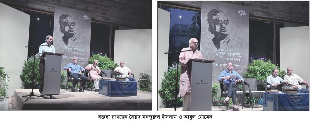 তিনি আমাদের দৃষ্টি ফেরালেন সেই সময়ে যখন সোস্যাল মিডিয়া ছিল না, তখন মানুষের হাতে বই ছিল। এখন মানুষের হাতে বই নেই। এই বিপদের কথা আবুল মোমেন তাঁর প্রবন্ধে বলেছেন, আমরা এখন বামনায়নে বিশ্বাস করি। কিন্তু এটা তো সত্য যে অন্যকে খাটো করে কেউ বড় হতে পারে না। এখন ‘আমি’ ও ‘অপর’-এ বিভক্ত করে ফেলেছি। আমি পূত-পবিত্র, অন্যেরা কদর্য, যে আমার সঙ্গে একমত হয়নি সে কদর্য। এটাই অপরায়ন। বিদেশের এয়ারপোর্টে আমাদের দেখলে ‘সাদা চামড়া’ ভাবে এই আপদ কেন প্রবেশ করছে, অথচ ঔপনিবেশিক শাসনের ফলমূল তারা খেয়েছে। এরা হলো শংকর ইংরেজ। রবীন্দ্রনাথ বলেছেন আত্মশক্তি বিকাশের জন্য শিক্ষার প্রয়োজন। সংস্কৃতিহীন শিক্ষা অসম্পূর্ণ শিক্ষা। আমাদের জাতীয় অভিপ্রায় প্রয়োজন। আমরা জানি না ভবিষ্যৎ কেমন হবে। আবুল হাসনাত যে সমাজে, বিশেষ করে সংস্কৃতির জগতে, মননচর্চায় সর্বাঙ্গীন বিকশিত মানুষ তৈরির চেষ্টা করেছেন―এটা নিশ্চিত। অধ্যাপক সৈয়দ মনজুরুল ইসলাম তাঁর অত্যন্ত মনোগ্রাহী বক্তৃতাটি এই বলে শেষ করলেন যে আবুল হাসনাত নিশ্চয়ই ভালো কিছু করেছেন যে জন্য আপনারা এ সভায় এসেছেন। তাঁর আশাবাদ আবুল হাসনাত বহুকাল প্রাসঙ্গিক হয়ে থাকবেন।