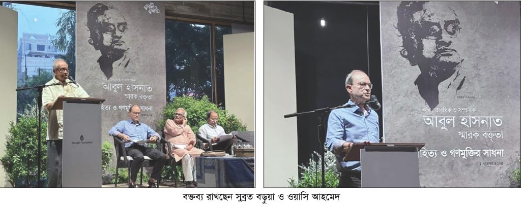পরিচিতি ও ভূমিকার পরে স্বাগত বক্তব্য রাখলেন কালি ও কলম পত্রিকার বর্তমান সম্পাদক প্রথিতযশা সাহিত্যিক সুব্রত বড়ুয়া। তিনি বললেন, আবুল হাসনাত স্মারক বক্তৃতায় এসে কেবল যে ওই বহুমুখী সৃজনশীল মানুষটিকে স্মরণ করি তা নয়, আরও অনেক কিছু স্মরণ করি, সাহিত্য-সংস্কৃতির চর্চাকে স্মরণ করি, একই সঙ্গে নিজের পথচলারও মূল্যায়ন করি। আবুল হাসনাতের সঙ্গে তাঁর পরিচয় ষাটের দশকের মাঝামাঝি থেকে যখন তাঁদের ছাত্রজীবন। আবুল হাসনাত আজীবন সাহিত্য, সংস্কৃতি, প্রগতিশীল রাজনীতির সঙ্গে সম্পৃক্ত ছিলেন। দীর্ঘ ৩০ বছর দৈনিক সংবাদের সাহিত্য সাময়িকীর পাতা সম্পাদনা করে কিংবদন্তি হয়ে ওঠেন। ২০০৪ সালে তিনি কালি ও কলম পত্রিকার সম্পাদনার দায়িত্ব গ্রহণ করেছিলেন। আমৃত্যু তাঁর দক্ষ সম্পাদনায় পত্রিকাটি সমৃদ্ধ থেকে সমৃদ্ধতর হয়ে উঠেছে। আজও কালি ও কলম তাঁর প্রবর্তিত ও অনুসৃত ধারাই অক্ষুণ্ন রেখেছে। তিনি কালি ও কলম-এর আহ্বানে যারা বেঙ্গল শিল্পালয়ে উপস্থিত হয়েছেন তাদের আন্তরিক ধন্যবাদ জ্ঞাপন করলেন।